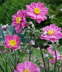 Анемона японская 'Принц Хейнрих' — это эффектное растение, достигающее высоты 60-90 см. Его изящные цветы с нежными розовыми лепестками и желтыми тычинками распускаются в конце лета и цветут до осени, привлекая внимание пчел и бабочек. Листва имеет ярко-зеленый цвет, что создает контраст с цветами и делает растение привлекательным даже вне периода цветения.
