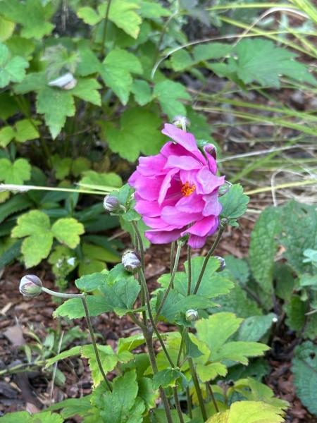 Анемона японская 'Принц Хейнрих' — это эффектное растение, достигающее высоты 60-90 см. Его изящные цветы с нежными розовыми лепестками и желтыми тычинками распускаются в конце лета и цветут до осени, привлекая внимание пчел и бабочек. Листва имеет ярко-зеленый цвет, что создает контраст с цветами и делает растение привлекательным даже вне периода цветения.
