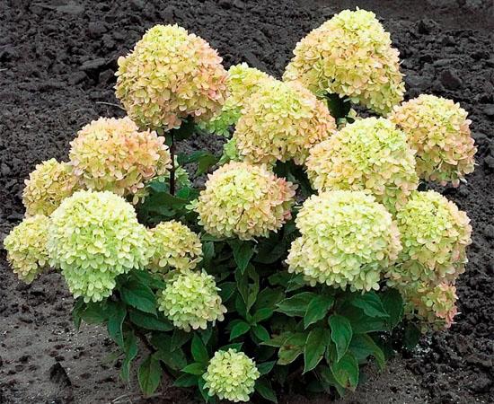 Компактная малышка с многочисленными цветками. Образует кустик высотой 0,5 - 0,6 м и диаметром 0,6 - 0,8 м. Окрас цветков сливочно-зеленыи, в зависимости от pH почвы и сезона может дать розовинку. Размер соцветия: 15-20 см. Цветение обильное в июле-сентябре.