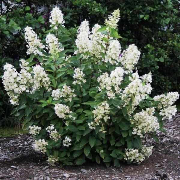 кустарник 1,7 - 2 м высотой и 1,4 - 1,6 м шириной. Побеги не толстые, но очень прочные, жесткие, прямостоячие, буро-красного цвета. Куст не разваливается, не требует подвязки. Листья яйцевидные, ярко-зеленые, немного шершавые. Соцветие состоит из стерильных и фертильных цветков, узкоконической формы с округлой приплюснутой верхушкой. Соцветие достаточно плотное, длиной 25-30 см. Цветки белые, по мере отцветания приобретают светло-розовую окраску. Стерильные цветки очень крупные 4-5 см, а в полном роспуске доходят до 7 см в диаметре
